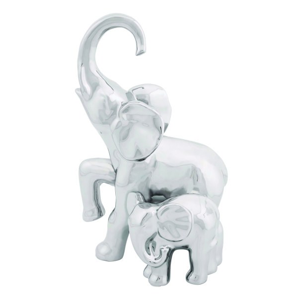 11" Silver Ceramic Mother Elephant with Baby Sculpture