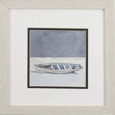 11" Square Blue and White Boat in Tan Frame Under Glass