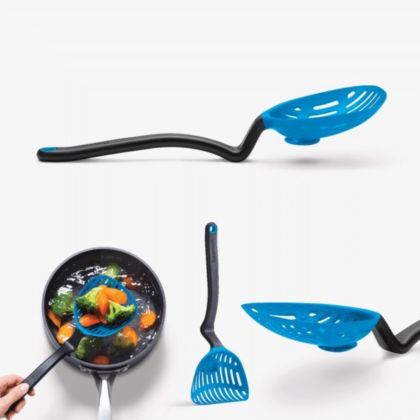 Lestrain is a scoop strainer that catches its own drips and sits up off your counter.