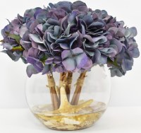 12" Faux Blue Hydrangeas in a Glass Ball With Seashells at the Bottom