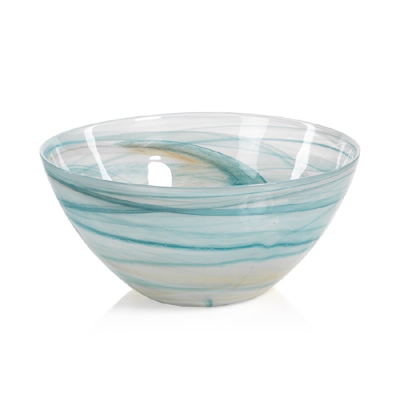 12" Round White, Aqua and Amber Swirl Alabaster Glass Bowl