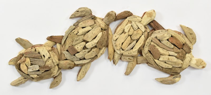 Weathered driftwood creates four graceful sea turtles in this unique coastal wall art that celebrates ocean wildlife with authentic beachcombing materials. Amazing for adding genuine seaside character while honoring the beauty of marine life through the natural textures and colors of sun-weathered coastal wood.