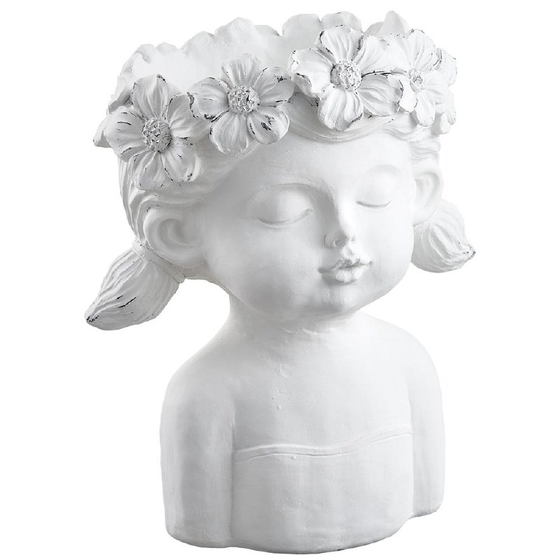 Use this distressed white polyresin flower girl bust to create a whimiscal ambaince while showcasing your flowers and plants. This pot will complement all types of decor so you can use it year round.