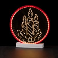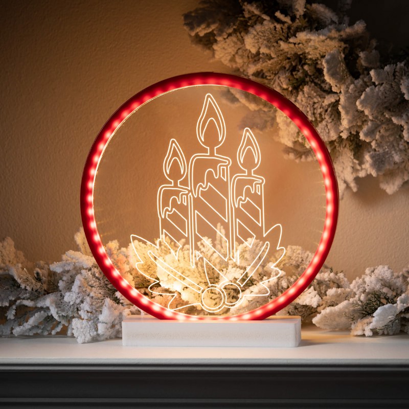 This warm white LED Christmas candle trio is inside a red ring and is the perfect festive accent. Whether indoors by the fireplace or outdoors on your porch, the exclusive design from Sullivans Home Decor casts a cheery glow that sets a mood of holiday cheer. The LED lights twinkle a candle image from within the red ring, evoking memories of Christmases from years past.