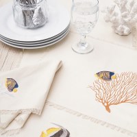Embroidered with pops of yellow and delicate sky blue, fish gracefully swim among the delicate coral reefs on these neutral-colored background.