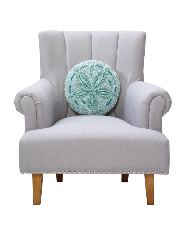 Bring the beach home with this round hooked pillow in a green sand dollar design. A soft, sculptural accent perfect for coastal chairs, beds, or window seats.