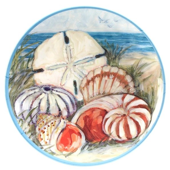Embrace the essence of the shore with this Seacoast Round Platter, a generous 14" piece that combines functionality with seaside artistry. Made from dishwasher safe 100% melamine, this platter is as durable as it is delightful, showcasing a vibrant tableau of beach treasures that will transport you to sandy shores and gentle waves. It's a dinnerware essential that allows you to mix and match with other unique items from this collection, making it a versatile addition to any culinary occasion.