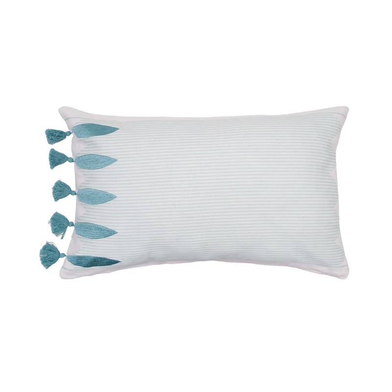 The Tassel Fish Pillow effortlessly combines coastal charm with a touch of whimsical elegance. The pillow features a soft, printed sea glass and white striped background, evoking the refreshing colors of the ocean. Adorning the edges are fish-shaped tassels, each carefully crafted to extend beyond the pillow’s borders, creating a unique and playful effect. The fish tails are finished with delicate tassels that add texture and movement, bringing a dynamic, upscale coastal vibe to any space. This decorative pillow is perfect for adding personality to living rooms, bedrooms, or outdoor areas, making it an ideal accent for those seeking to enhance their coastal or nautical-themed decor with a stylish, eye-catching design.
