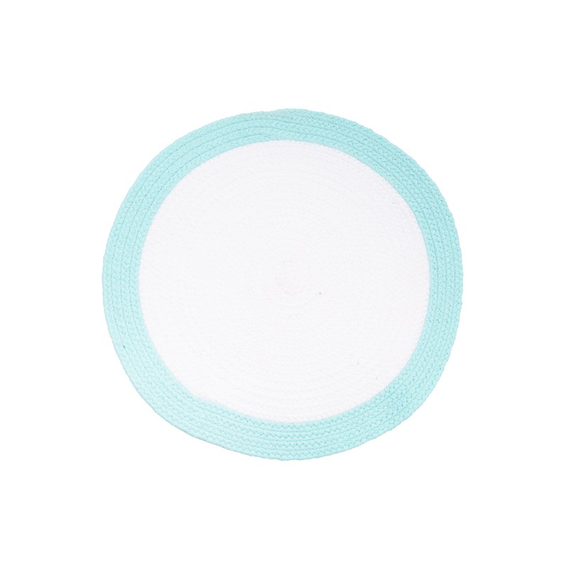 Break the boring table monotony with these bright indoor/outdoor placemats. Aqua encircles a white center of braided polyester material for an eye-catching tablescape. These versatile placemats are perfect for summer gatherings, or everyday use.