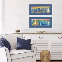 Playful sailboats bustle along the shore in a frenzy of activity. Matted in ocean blue and framed in a modern flat white moulding. Under Glass