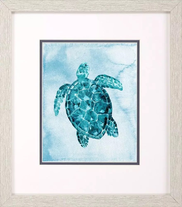 A bright blue sea turtle are matted in white and blue. Framed in a distressed whitewash finish moulding.