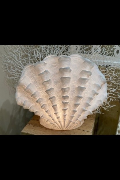 This unique large standing scallop lamp is made of a combination of polyresin, fiberglass and sandstone. The casting materials used are formulated to give each creation a natural sun bleached and wave tumbled color and finish. Add a low watt light bulb to create a soft glow. Intended for indoor use only.