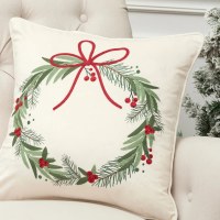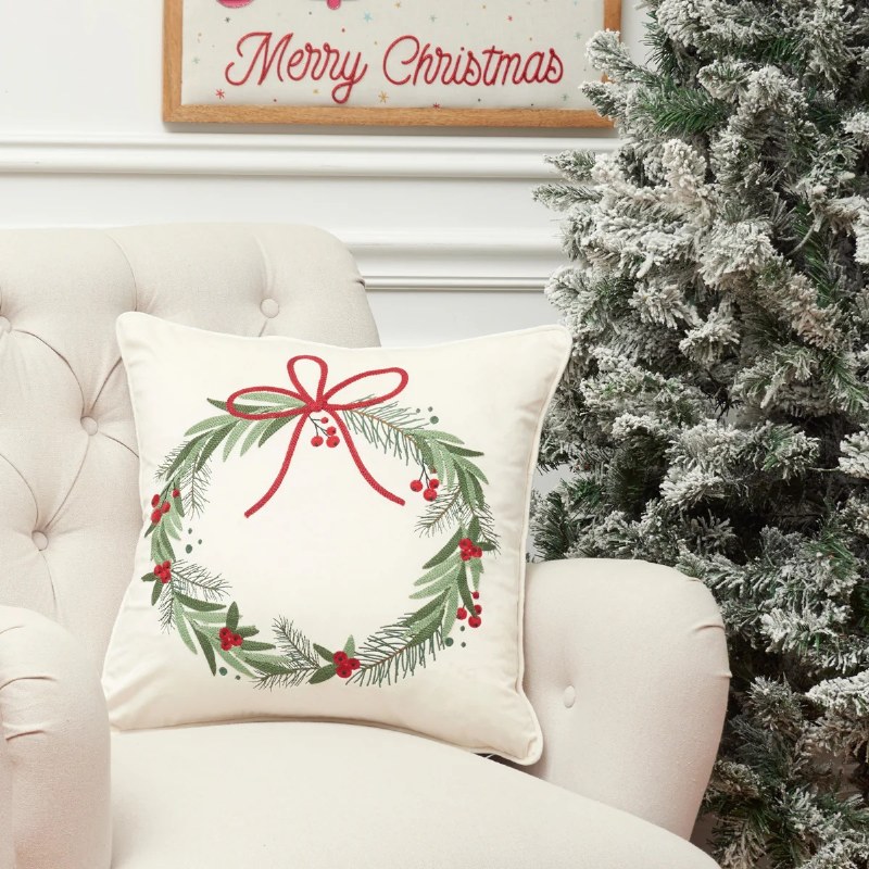 This beautifully embroidered Christmas Wreath Pillow, set against a crisp white background, showcases an abstract wreath design adorned with delicate berries and leaves. A bright red bow tops the wreath, adding a pop of color and holiday cheer. Perfect for enhancing seasonal decor, this pillow brings warmth and charm to any room.