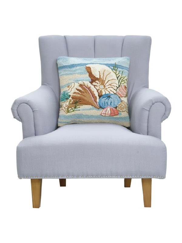 Add a splash of seaside charm with this 18" square hooked pillow showcasing a vibrant arrangement of seashells by the shore. A perfect coastal accent for beach homes, patios, or ocean-inspired interiors.