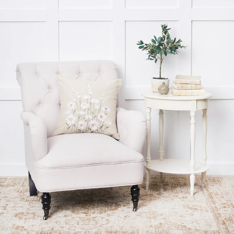 For an elegant pillow with a neutral background, this embroidered decorative accent piece features delicate daisies gracefully expanding across the cover. This timeless floral display adds an elegant touch suitable for year-round decor.