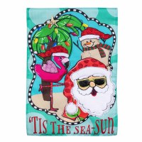 Add magic and wonder to any garden or yard when you hang up this beautiful flag. Featuring Santa Claus on a beach, this flag is perfect for the festive season. Each Evergreen applique flag is carefully crafted from multiple layers of 310 denier nylon made from recycled plastic that can withstand a variety of weather conditions. We combine pieces of fade-resistant, strong fabric with tight, detailed stitching to create a dimensional mosaic effect. The soft yet heavyweight material illuminates beautifully in sunlight. Each flag features a sleeve that fits standard flagpoles or stands, sold separately. Due to the nature of the packaging, wrinkling may have occurred. Once item is unfolded and mounted on hardware, the creases will naturally fall out. Spot clean only. Never put in a dryer. When not in use, flags can be hung in a closet or placed in a storage container.