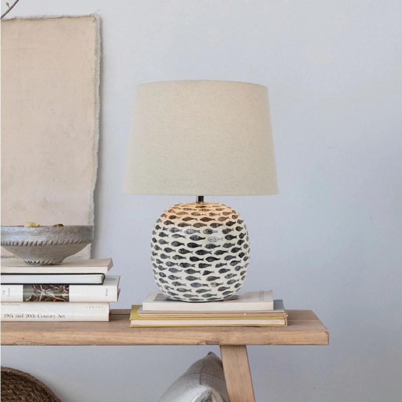 Mood lighting meets modern art in our thoughtfully curated collection of floor and table lamps. Explore a wide array of textures, hues, sizes, and silhouettes to find the perfect fit for any space, including vintage reproductions, lanterns, A-frames, abstract asymmetrical bases, figurine lamps, and so much more. Choose from a vast selection of materials from solid marble and reclaimed wood to terracotta and glass, and styles from mid-century modern and classic farmhouse to vintage glam and boho. The thoughtful placement of a floor or table lamp from this hand-picked collection will create a warm and welcoming ambiance that is guaranteed to impress. This nautical table lamp features an intricately pieced capiz fish design on a bamboo base and finished with a white linen shade. Display in a living space of any style from coastal to nautical. Maximum 60W bulb not included. Made from bamboo and capiz.
