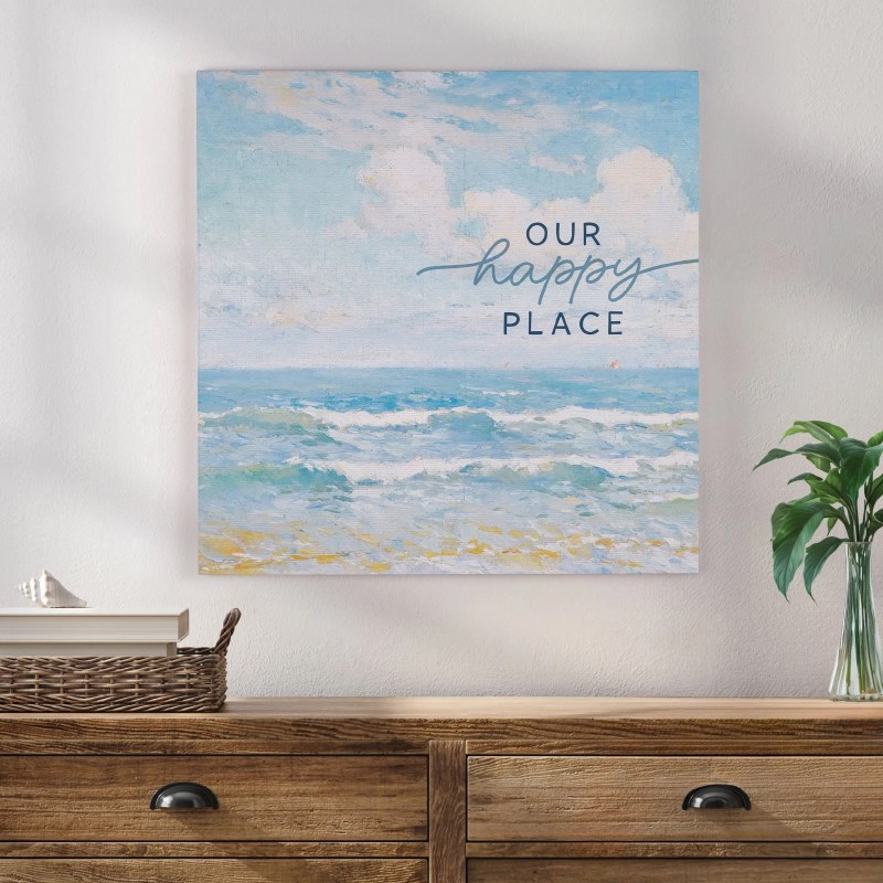 20" Sq "Our Happy Place" Coastal Canvas Wall Art Plaque