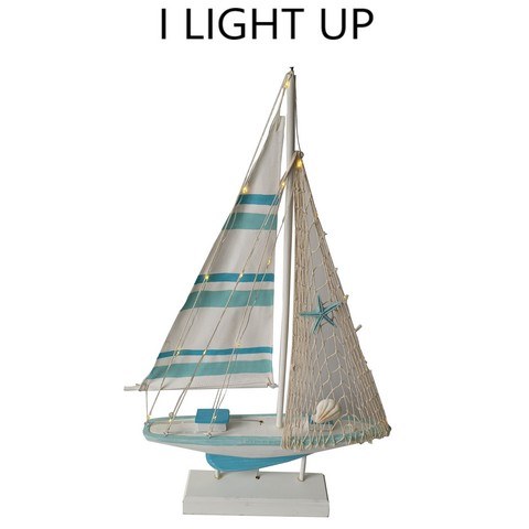 This blue and white sailboat statue lights up to bring a warm coastal glow. Perfect for mantels, consoles, or beach house displays needing a nautical touch.