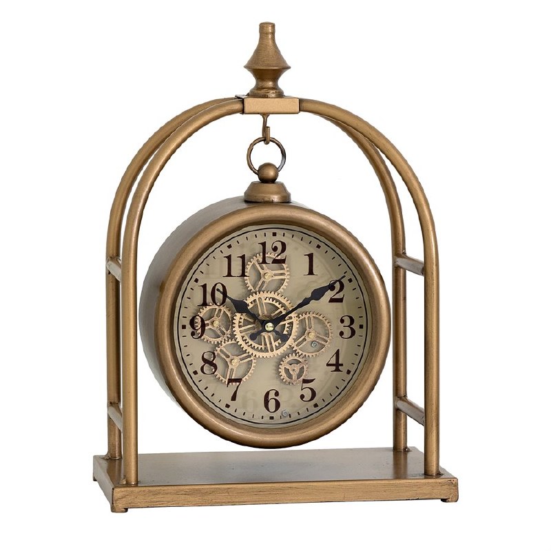 This table clock displays working gears under glass with Arabic numerals on the face surrounded by a Providence Gold design.
