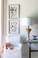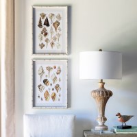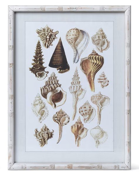 Distressed frame of whitewashed wood showcase a Murex shell in varying neutral shades from white to tan, beige to brown. A beautiful display of this intricate shell, our Seashell Collection Print elicit childhood memories of collecting treasures on the seashore.