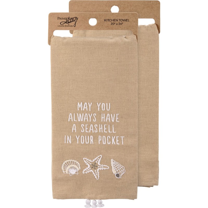 A cotton linen blend kitchen towel featuring a stitched art panel with embroidered "May You Always Have A Seashell In Your Pocket" sentiment with seashell and starfish designs. Includes tassel accents for added interest. Our A Seashell In Your Pocket kitchen towel is machine-washable. Towel is packaged on a cardboard hanger with a hole to easily hang a rack.