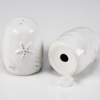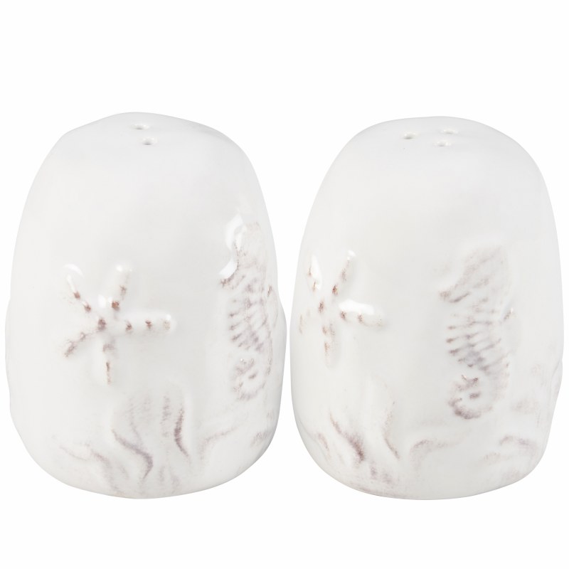 A set of ceramic salt and pepper shakers from our Beach Collection displaying a clean white glaze finish with embossed designs of various sea life and ocean plants around the outside. Embossed ocean designs feature textured detail. Shakers include unique openings to tell them apart as well as plastic stoppers for easy refilling and cleaning. Our Beach salt and pepper shakers are microwave, dishwasher, and food safe for convenient use. A set of everyday tableware perfect for oceanic themed gatherings.