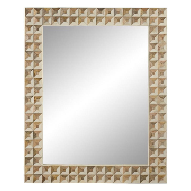 Featuring a stunning mosaic of bone and mango wood inlay, this mirror showcases a unique geometric design that adds texture and visual interest. Its classic rectangular shape is ideal for reflecting light and making your room feel more spacious. Versatile in design, it can be hung both horizontally or vertically to suit your space's needs. Perfect for transitional and contemporary decor, this mirror complements various styles. The geometric pattern is also available in matching side tables, trays, and boxes for a cohesive look. Due to the handcrafted nature of the materials, expect slight variations in color and finish, enhancing the natural beauty and individuality of each piece.