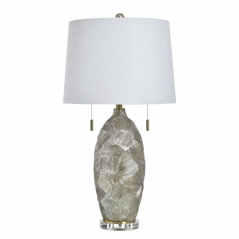 Sleek and softly luminous, this 32" table lamp features a sculpted polyresin base detailed with delicate silver-lined texture. Finished with a classic fabric shade and convenient double-pull chains, it offers refined style and warm illumination—an elegant accent for contemporary and transitional interiors.