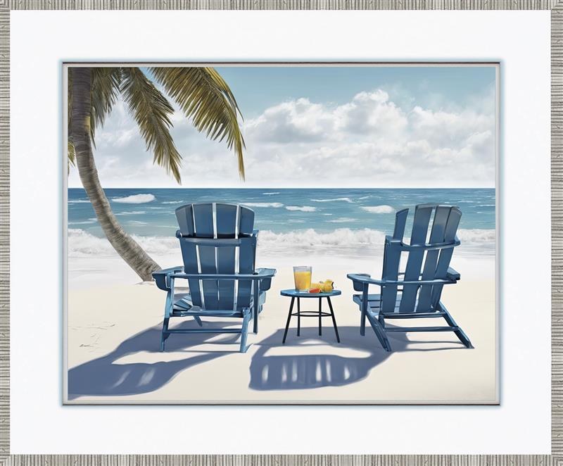 Transform your space with the 32" x 38" Vacation Views 1 Framed Coastal Print Under Glass. Featuring two lounge chairs overlooking the waves on the beach, this beautiful artwork evokes the essence of relaxation and seaside escape. The protective glass enhances the vibrant colors while ensuring durability. Perfect for your living room, beach house, or office, this framed print brings a serene coastal vibe into your home!