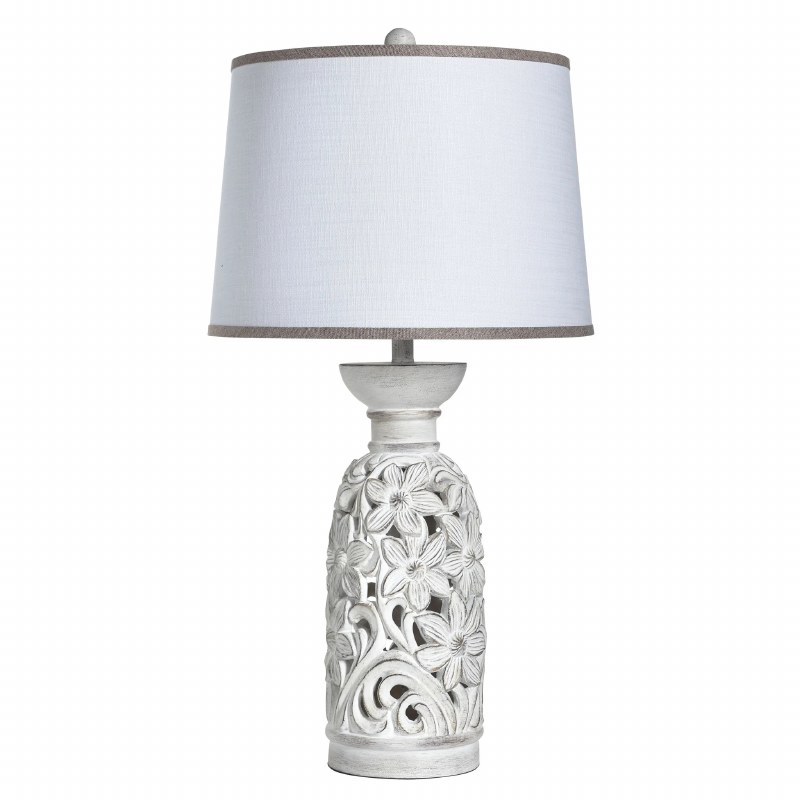 Intricately sculpted openwork florals in a softly distressed white finish give this 33" table lamp graceful depth and charm. Crafted from durable polyresin and paired with a classic fabric shade, it casts a warm, inviting glow - an elegant accent for cottage, coastal, or transitional interiors.