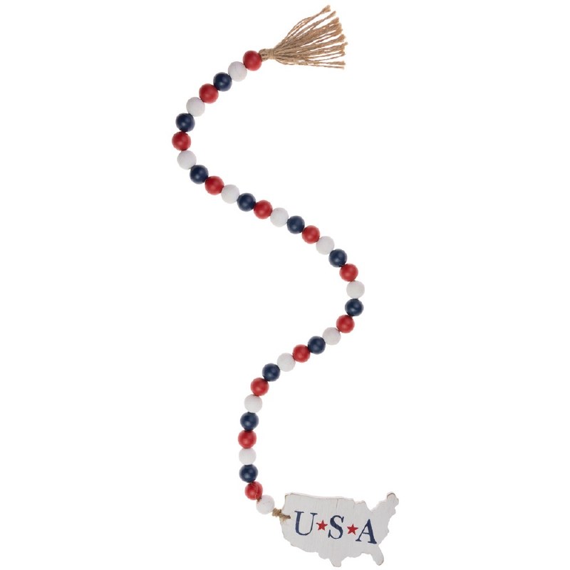 Celebrate the red, white, and blue with a strand of painted wooden beads, finished with a natural jute tassel and an MDF USA map charm. Drape it over a mantel, coil it in a tray, or wrap it around a vase for an easy accent that brings patriotic character to any room.