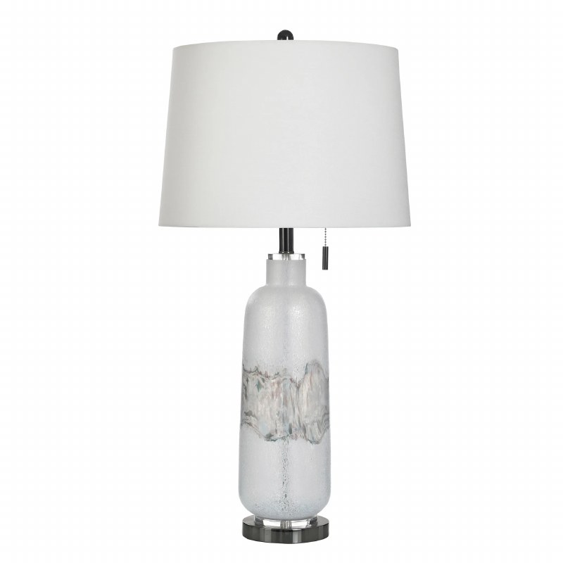 Softly luminous and refined, this 34" glass table lamp features a white, translucent body accented with flowing silver detailing that catches the light with subtle elegance. Finished with a clean fabric shade and polished base, it brings a calm, sophisticated glow to contemporary, coastal, or transitional spaces.