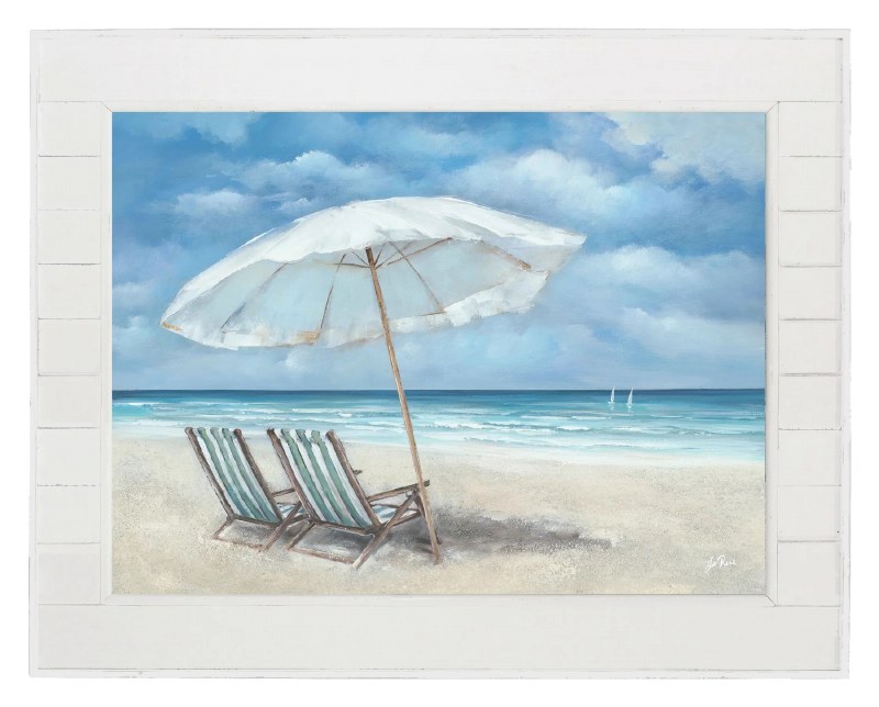 Shiplap-framed giclée canvas featuring two beach chairs and an umbrella on a peaceful shoreline. Hand embellishments add texture to this relaxing seaside scene, perfect for creating a welcoming coastal vibe.