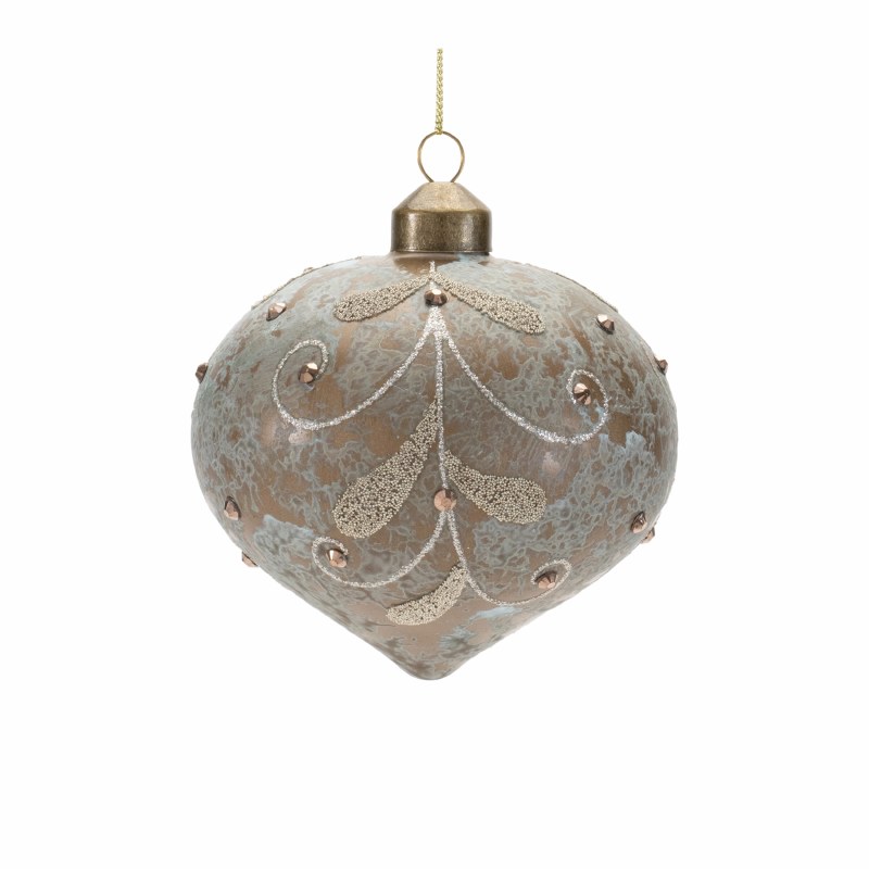 Add a vintage touch to your Christmas decor with this 4" distressed gold and verdigris glass onion ornament, featuring an intricate leaves design. Perfect for creating an elegant charm on your tree or holiday display, this unique ornament brings a timeless feel to your decor.