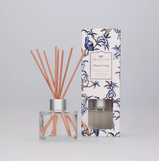 The irresistible allure of freshly laundered sheets, Classic Linen layers sweet spring air with cooling water notes. Soft floral blooms embrace warming balsamic accords in utterly luminous fashion. Fresh fragrance in a neutral glass reed diffuser makes a Classic Linen reed diffuser the perfect complement to your every day, and our fiber reeds provide twice the fragrance of traditional rattan reeds with no need to flip! This diffuser contains 4 fl oz of Classic Linen reed diffuser oil, which will diffuse for up to 30 days.