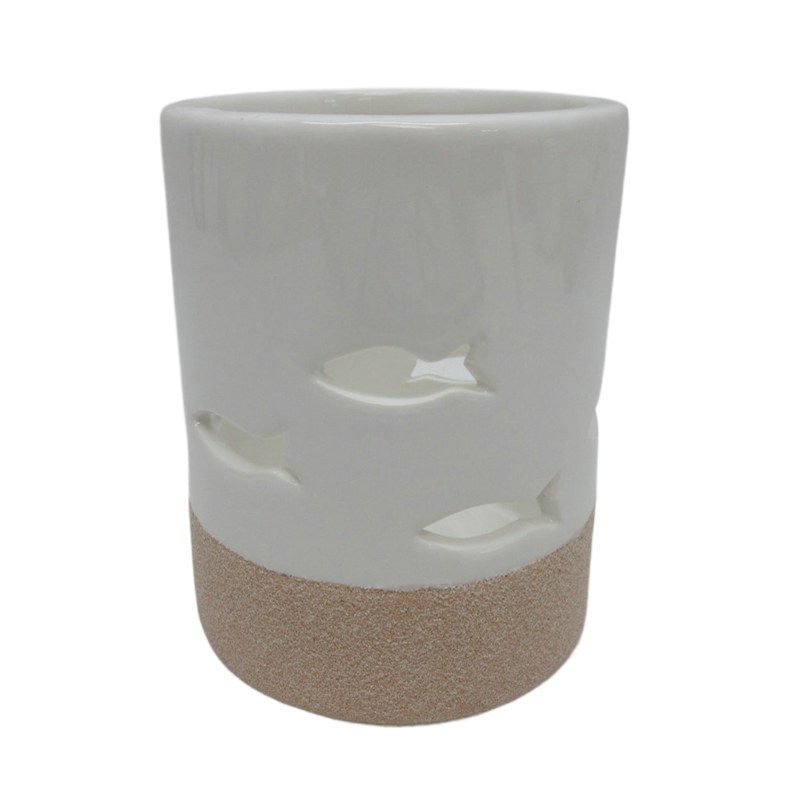 Bring a coastal touch to your space with this white and sand votive holder with fish cutouts. It is perfect for small votive candles, it creates a soft glow and fits in with any coastal decor.