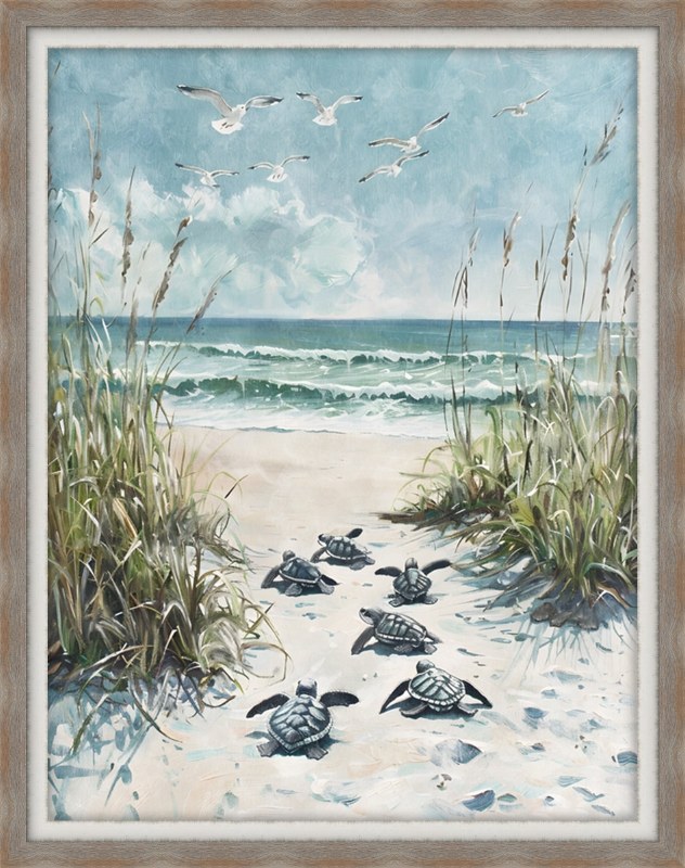 44" x 34" Sea Turtle Hatchlings 1 Gel Textured Coastal Print in a Brown Wood Grain Frame