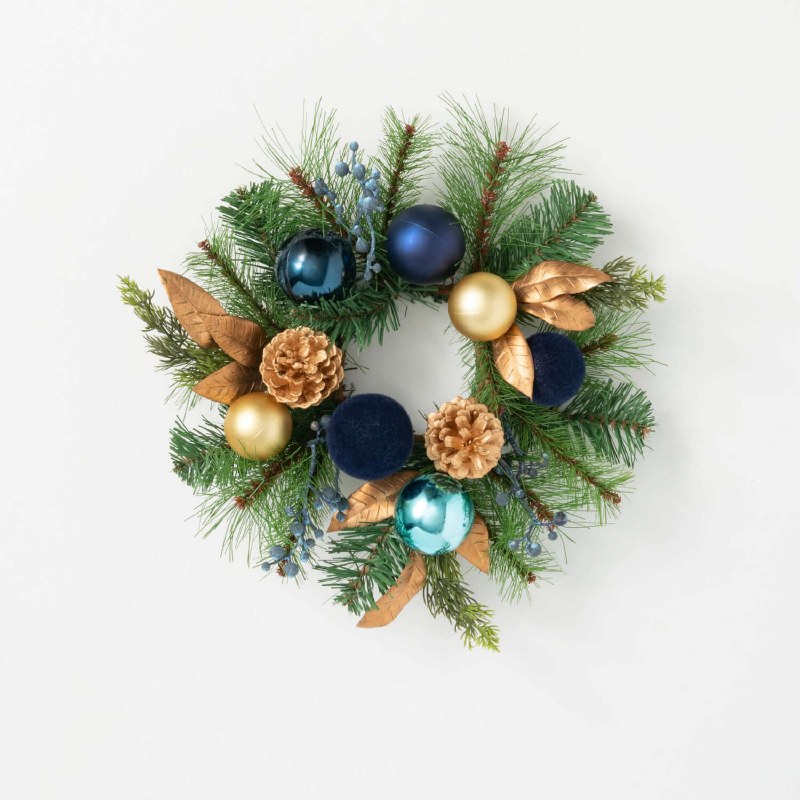 Embellished with rich blue & shimmering gold ornaments, this decorative pine botanical is an eye-catching collection great for the holidays. Exclusive to Sullivans, lush faux greens are delightful accented with gold leaves, berries & pinecones, making this 4.5" mini wreath an elegant option.