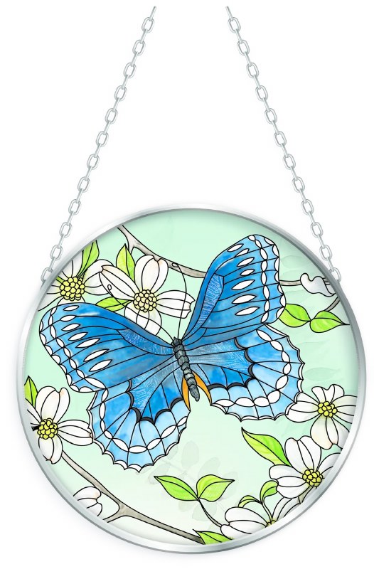 Invite the beauty of a flourishing garden into your home with this botanical glass suncatcher. The detailed design showcases a butterfly and a variety of botanical elements, creating a captivating display of light and color when hung in a sunny window.