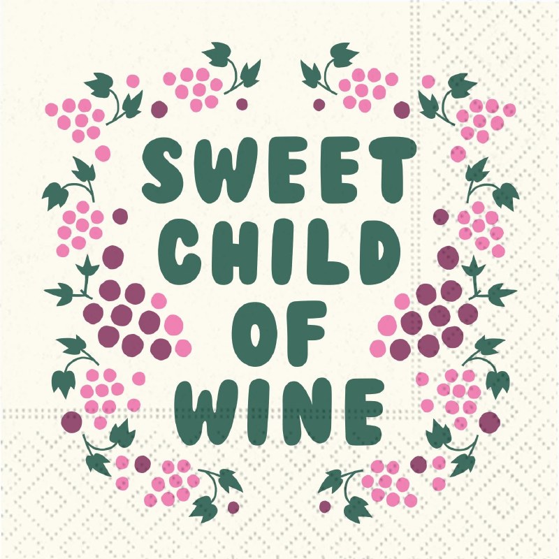 Add a touch of rock 'n' roll to your wine nights with "Sweet Child of Wine" beverage napkins, these stylish 3-ply napkins feature a fun design in a vibrant color palette. Each pack contains 20 napkins, perfect for entertaining with flair. Celebrate in style and bring a smile to your guests' faces with these charming and playful cocktail napkins.