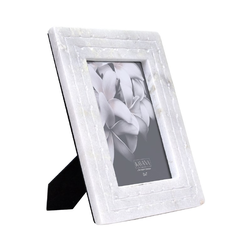 Add a refined accent to your decor with the Kaeden Frame 5x7, a beautifully crafted photo frame made from luxurious white marble with subtle gray veining. Measuring 8.5L x 0.5W x 10.5H, this frame is designed to hold a 5x7 image and features a minimalist etched rectangle pattern around the inner border, adding depth and sophistication without overwhelming your display. Its crisp white tone and cool gray variations make it a versatile piece that complements a wide range of interiors, from contemporary to classic. The sturdy easel back offers flexibility for vertical or horizontal display on desks, mantels, or shelving. Perfect for showcasing cherished moments or enhancing upscale decorative arrangements, the Kaeden Frame 5x7 is ideal for retailers, designers, and hospitality buyers seeking high-end wholesale photo frames that deliver both beauty and quality.