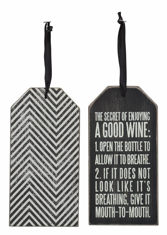 Classic black and white wooden bottle tag featuring distressed "The Secret To Enjoying A Good Wine: 1. Open The Bottle To Allow It To Breathe. 2. If It Does Not Look Like It's Breathing, Give It Mouth-To-Mouth" sentiment with reverse directional stripe designs. Top fabric loop for attaching to a bottle of wine.