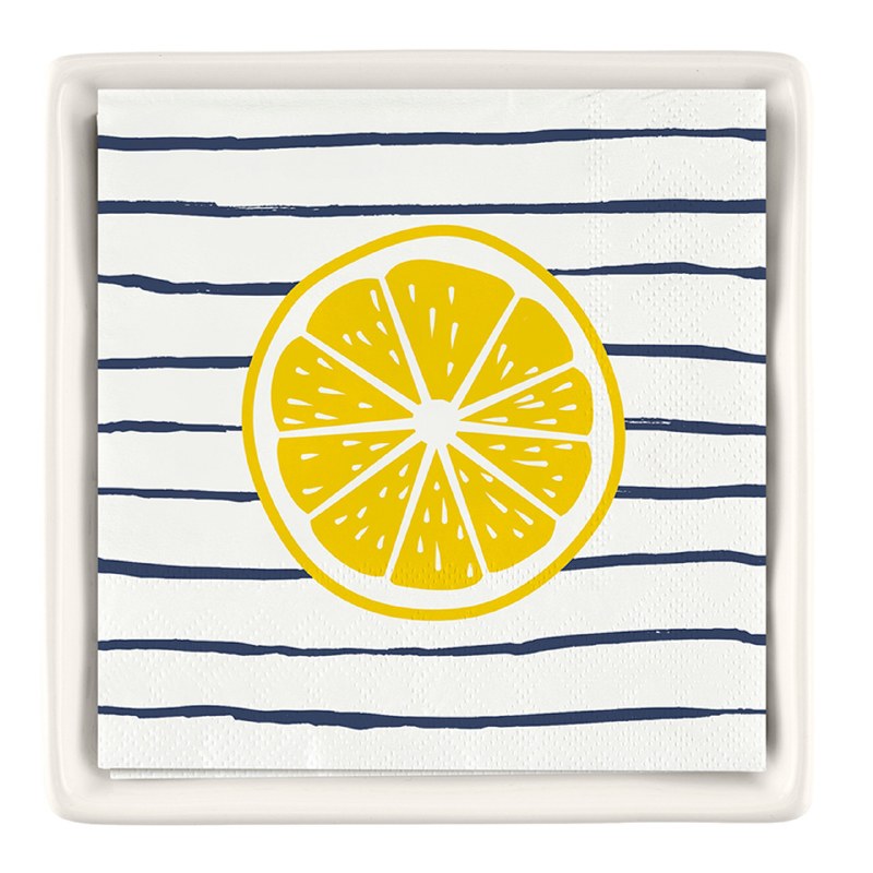 This ceramic napkin tray with Striped Lemon paper cocktail napkins is a stylish and practical accessory for organizing and presenting napkins during social gatherings or special occasions. A touch of velvet on the base elevates the look, while the sunny yellow?and?white striped lemon pattern adds a playful pop of citrus charm.