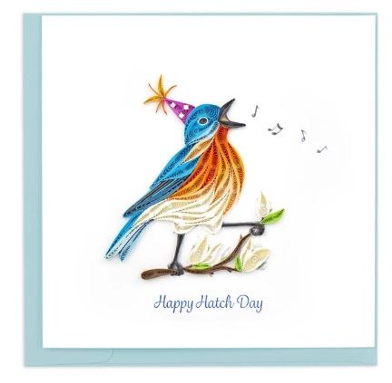 Celebrate the day your loved one was hatched with this cheerful artwork! A quilled blue and orange bird signing while wearing a purple birthday day hat adorns the front of this card. The words "Happy Hatch Day" are printed underneath the artwork.