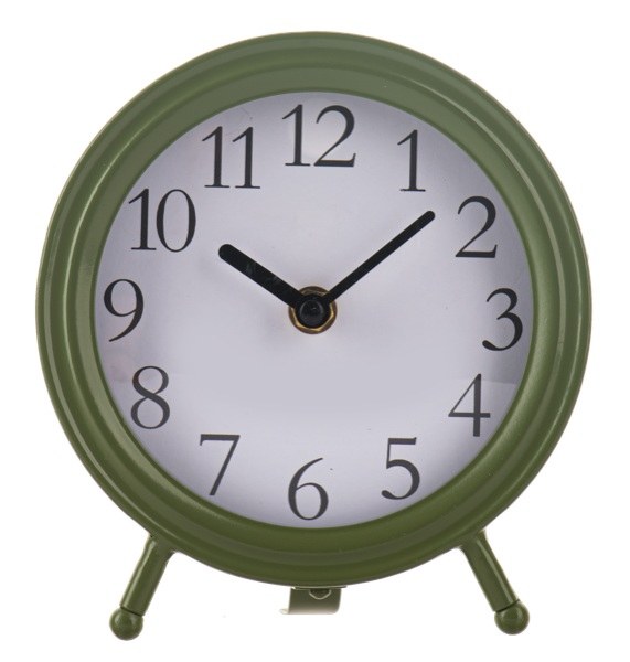 Dark green metal frame surrounds a white clock face with bold numbers that stand out from across the room. The sturdy legs keep it upright while the rich color complements both modern and traditional decor. Perfect for kitchens, home offices, or anywhere you want a timepiece that makes a statement without being flashy.