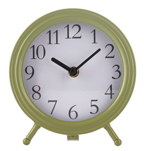 This metal desk clock features a light green frame with clean white face and black numbers for easy reading. The two-leg design sits stable on surfaces while the 7-inch size works well on nightstands, desks, or shelves. Great for adding soft color to bedrooms, offices, or any space that needs reliable timekeeping with style.