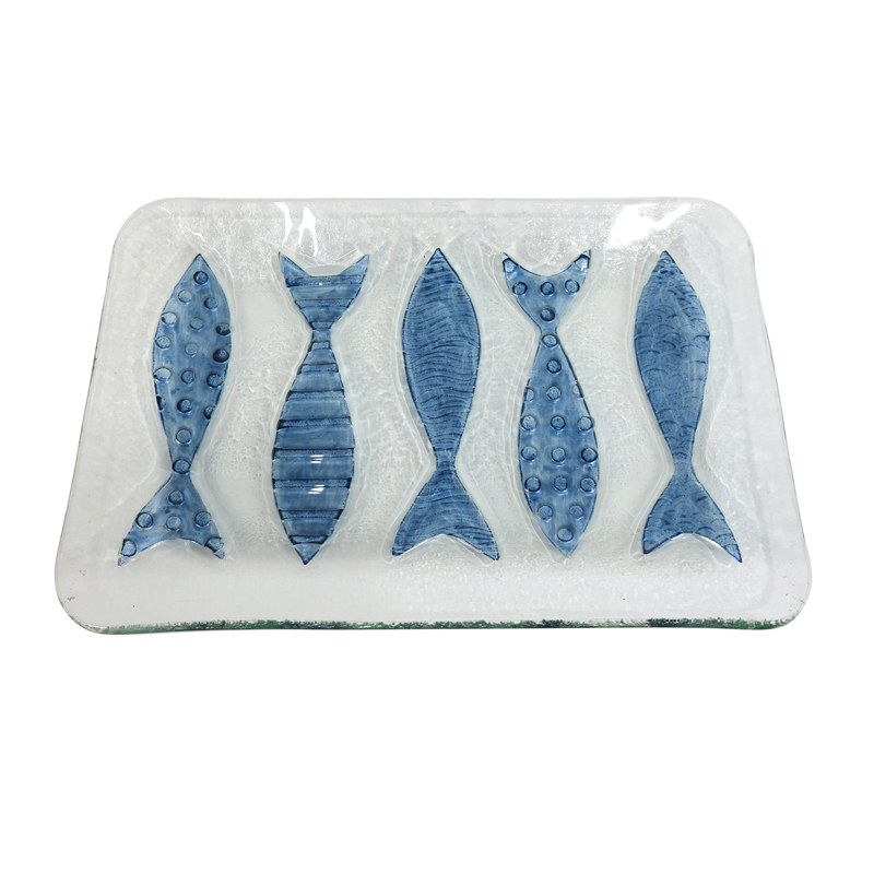 8" x 12" Clear and Blue Fish Pattern Coastal Glass Tray