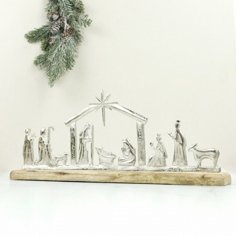 8" x 20" Silver Metal and Wood Nativity Scene Figurine