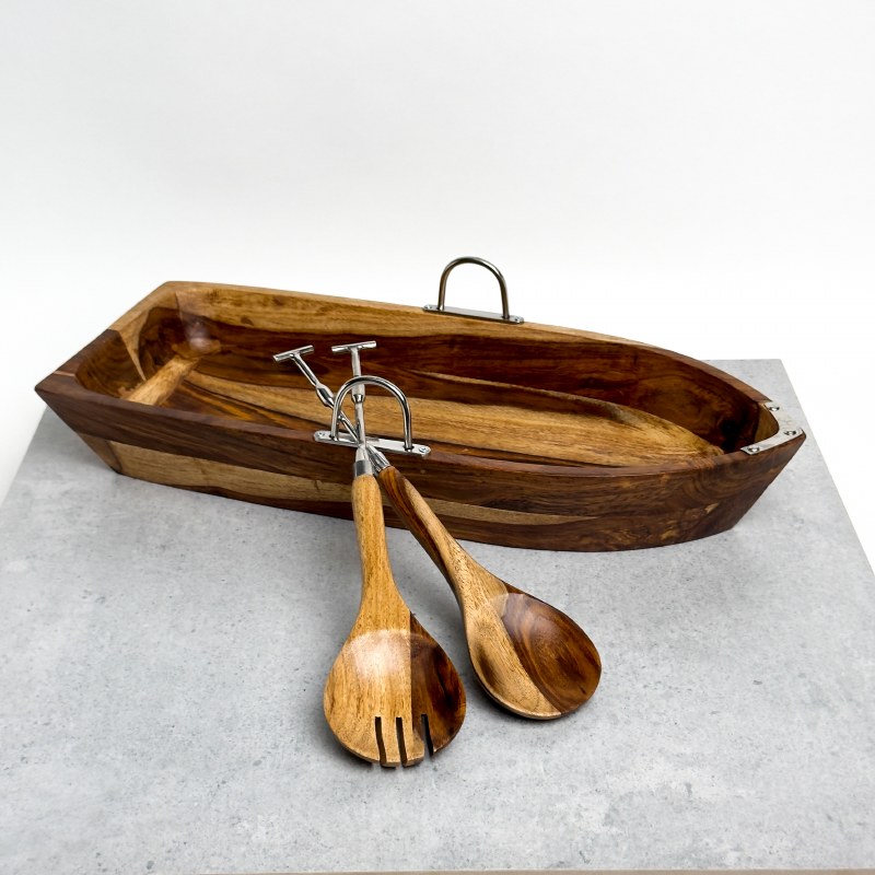 This beautifully crafted boat-shaped acacia wood salad bowl comes with matching salad servers, making it a perfect addition to your dining table. The rich wood grain and natural beauty of acacia wood create a rustic yet elegant presentation for your salads or side dishes. Featuring polished aluminum boat accents, this unique serving piece adds a nautical charm to your décor. The included wooden salad servers complete the set, making it ideal for entertaining or everyday use.
